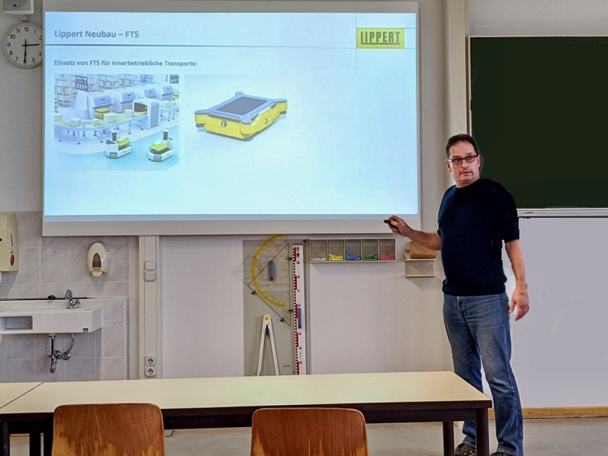 Im zweiten Hauptteil seines Vortrags gewährte der Referent einen Einblick in den Neubau der Unternehmens Lippert in Eschenbach. Insgesamt entstehen dort auf rund zehn Hektar Gewerbefläche ca. 36.000 Quadratmeter Geschoßflächen. Ein besonderes Augenmerk wurde bei der Planung auf einen optimierten Materialfluss gelegt, welcher u.a. durch Fahrerlose Transportsysteme (FTS) für die Montageversorgung unterstützt werden soll.