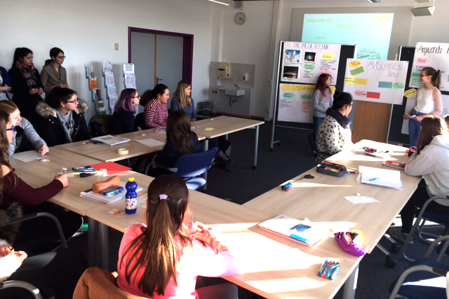 Um mehr über Ablauf und Inhalte der einzelnen Studienangebote zu erfahren, beschäftigten sich die Mädchen in Kleingruppen mit den einzelnen Studiengängen. Ihre Ergebnisse präsentierten sie ihren Mitschülerinnen auf selbstgestalteten Plakaten. In den Workshop lernten sie zudem zahlreichen Karrierewege kennen, die Ingenieurinnen nach einem erfolgreichen Studium offen stehen.
