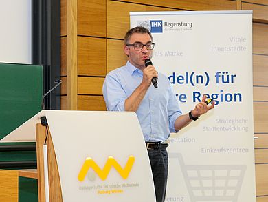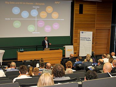 Die Veranstaltung „Handel 4.0 – Big Data im Handel“ nahm die rund 100 TeilnehmerInnen mit auf die Reise, beginnend bei der Wissenschaft und endend bei konkreten Praxiseinsätzen. Prof. Dr. Christian Schieder und Prof. Dr. Marco Nirschl, beide OTH Amberg-Weiden, erklärten zunächst, was unter Big Data zu verstehen ist und wo Daten einen Mehrwert generieren können. Als Anwendungsbeispiel nannten sie sogenannte Smart Stores. „Big Data und künstliche Intelligenz ermöglichen für den Handel völlig neue Möglichkeiten, um individualisiert Produkte oder Werbemaßnahmen auszuspielen“, so Prof. Dr. Marco Nirschl. Dabei ginge es bei Big Data nicht nur um einen Mehrwert für Händler, sondern auch um den Kunden auf der Suche nach dem Wunschprodukt.