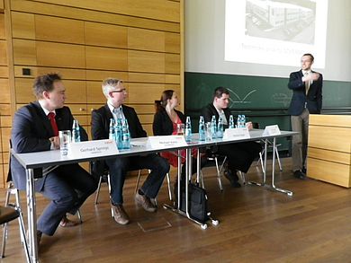 Im Rahmen des Podiumsgesprächs „Im Osten viel Neues!“ ging es um die Erwartungen und Anforderungen an die zukünftigen Fachkräfte und um die Potentiale des mittel- osteuropäischen Marktes. Die anwesenden Firmenvertreter, Gerhard Springs (Personalleiter der Firma HORSCH), Michael Kuhn (Prokurist Technické pružiny SCHERDEL s.r.o) und Herr Jiří Janda (HAW Alumni und Ingenieur bei ŠKODA AUTO) waren sich einig, dass man interkulturelle Kompetenz nur "vor Ort" erwerben kann und neben Berufserfahrung für die Unternehmen auch die Persönlichkeitsentwicklung der Bewerber entscheidend ist – ein Auslandsaufenthalt kann Letztere fördern.