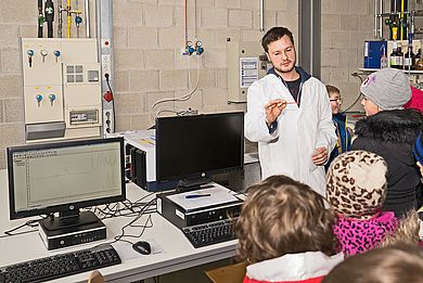 Aufgeteilt in kleinere Gruppen erfolgte anschließend eine Besichtigung des Chemielabors von Prof. Dr. Peter Kurzweil. Hier erfuhren die Schülerinnen und Schüler, dass man jeden Kunststoff auf seine exakten Bestandteile hin analysieren kann. So hat auch jedes Loom-Band quasi seinen eigenen „Fingerabdruck“, an dem sich ablesen lässt, ob sich darin eventuell Schadstoffe befinden. Den Abschluss des Besuchs bildete die Besichtigung des Labors Kunststofftechnik/Kunststoffverarbeitung, wo die Kinder eine Spritzgießmaschine im laufenden Betrieb vorgeführt bekamen. Hier wurden Geodreiecke – ein nützliches Utensil für den Schulalltag – gefertigt. Neben Geodreiecken nahmen die Dritt- und Viertklässler auch noch Frisbees, Stehauf-Kreisel und kleine, bunte Spielzeugautos aus Kunststoff sowie ganz viele neue Eindrücke mit nach Hause.