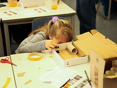 Was ist eigentlich der Unterschied zwischen Schule und Hochschule und was haben sie gemeinsam? Damit begann der Hochschultag für die Kinder. Besonders verblüffend: Einige der jungen SchülerInnen kannten sich bereits sehr gut aus, weil sie später vielleicht studieren möchten. Nach dieser kurzen Einführung begann der „Vorlesungsbetrieb“ mit dem Thema „Wunder des Lichts – woher kommt der Regenbogen?“. Die Kinder bekamen erklärt, wie Lichtbrechung funktioniert und warum dabei aus weißem Licht ein bunter Regenbogen entsteht. Nach der Theorie folgt die Praxis: Unter Anleitung von den vielen engagierten Helfern bastelten die Kinder sich selbst ein einfaches Spektroskop, mit dem man das Licht verschiedener Quellen in seine Bestandteile zerlegen und analysieren kann.