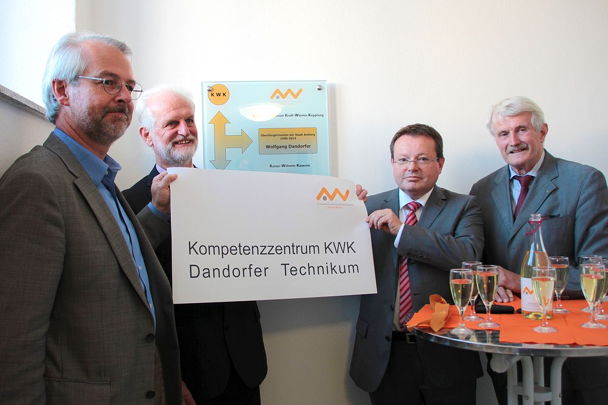 Mit dieser Erinnerungstafel wurde der ehemalige Oberbürgermeister von Präsident Prof. Dr. Erich Bauer, Dekan Prof. Dr. Stefan Beer (Fakultät Maschinenbau/Umwelttechnik) und Dr. Erich Voss (Vorsitzender Förderverein der "Amberger Freunde der Ostbayerischen Technischen Hochschule Amberg-Weiden“) überrascht. „Ich habe damit nicht gerechnet. Ich freu mich sehr darüber“, sagte Dandorfer bei der Enthüllung der Tafel. Die Tafel ist vorübergehend im Gebäude des Amberger Technologie-Campus angebracht. Sobald das Kompetenzzentrum Kraft-Wärme-Kopplung fertiggestellt, wird am Eingang ein anderes Schild montiert, und das "KWK" erhält zusätzlich den Namen: Dandorfer-Technikum.