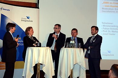 Prof. Dr. Markus Brautsch (Fakultät Maschinenbau/Umwelttechnik) referierte über das Thema „Flexibilisierung, Effizienzsteigerung und Anwendungsvielfalt – Innovationen nutzen“. In der anschließenden Podiumsdiskussion mit Ministerialdirigentin Dr. Ulrike Wolf, dem Vorstandsvorsitzenden der N-Ergie Josef Hasler, Fabian Schmitz-Grethlein vom VKU, und Prof. Brautsch wurden die aktuellen Entwicklungen in der KWK-Förderung beleuchtet, die insbesondere große kommunale KWK-Kraftwerke und die industrielle KWK vor Herausforderungen stellen, aber für kleinere kommunale Anlagen auch neue Chancen eröffnen. In der begleitenden Fachausstellung präsentierten M.Sc. Raphael Lechner und M.Eng. Michael Hebauer die Forschungsthemen des Kompetenzzentrums KWK.
