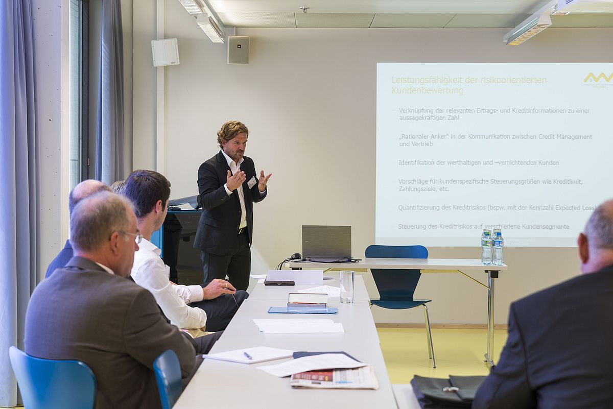 In seinem Vortrag „Risikoorientierte Kundenbewertung: eine Fallstudie“ definierte Prof. Dr. Thorsten Hock eine finanzwirtschaftliche Kennzahl, die den Wert eines Kunden für ein Unternehmen aus quantitativen Informationen ableitet. Diese Kennzahl erlaubt eine ganzheitliche Beurteilung. Schwerpunkt bildete die Messung des Kreditrisikos eines Kunden im Rahmen eines Lieferantenkredites.