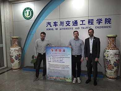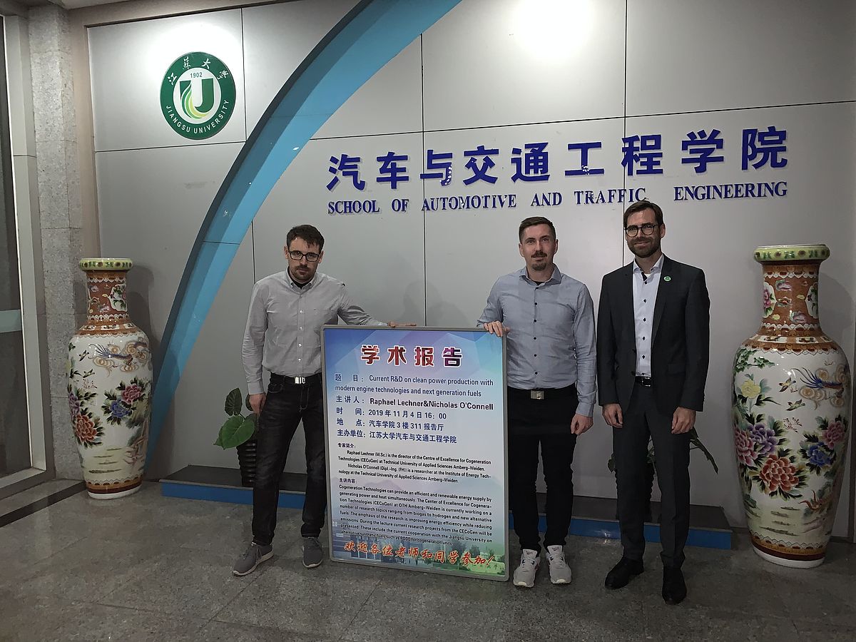 Den Besuch in Japan verknüpften die Forscher mit einem Abstecher an die Jiangsu University in Zhenjiang, China, an der Andreas Röll, M.Eng., vom Kompetenzzentrum für Kraft-Wärme-Kopplung derzeit in einem kooperativen Verfahren mit der OTH Amberg-Weiden promoviert. Schwerpunkt der Kooperation mit School of Automotive and Traffic Engineering der Jiangsu University ist das Einspritzverhalten von synthetischen Kraftstoffen für die Nutzung in Dieselmotoren. Die aktuellen Arbeiten des KoKWK und IfE in diesem Bereich präsentierten Raphael Lechner und Nicholas O’Connell in einer Gastvorlesung „Current R&D on clean power production with modern engine technologies and next generation fuels“.