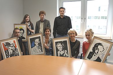 Die fünf Bilder haben Schülerinnen und Schüler der 11. Jahrgangsstufe/Fachrichtung Gestaltung ersonnen und angefertigt. Dafür erstellten sie Vorlagen aus Holz, mit denen sie die Bilder auf Papier druckten. Die Motive, passend zu einer technischen Hochschule, fünf Nobelpreisträgerinnen und Nobelpreisträger für Physik bzw. Medizin: