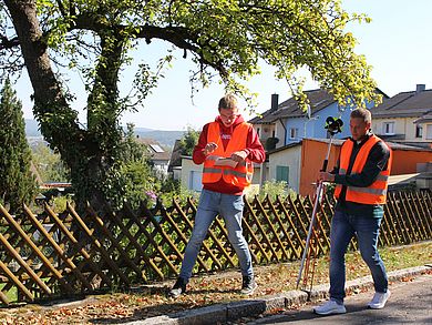 Auffällige Warnschilder und gelb-orange Warnwesten gab es in der vergangenen Woche sehr viele im Amberger Stadtteil „Luitpoldhöhe“ zu sehen. Der Grund: Die Studierenden des sechsten Semesters im Studiengang „Geoinformatik und Landmanagement“ führten unter Leitung von Prof. Dr. Ulf Kreuziger und Prof. Dr. Ralf Drescher örtliche Vermessungsarbeiten durch.