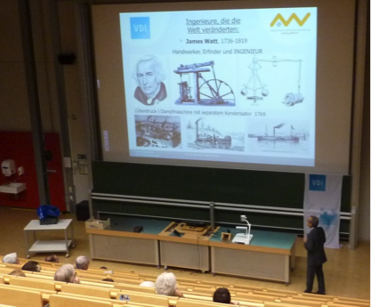 Zur Einstimmung führte Prof. Weiß den Besuchern das Grundprinzip der atmosphärischen Dampfmaschine auf dem Campus vor. Die Dampfmaschine ist sicherlich eine der Ingenieurleistungen, die zu ihrer Zeit die damalige Welt nachhaltig veränderte!