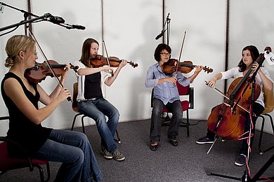 „Die Studioaufnahmen waren anstrengend. Aber für unsere Schülerinnen war diese Situation sehr motivierend“, so fasst Musikpädagogin Maria Anna Feldmeier-Zeidler vom Max-Reger-Gymnasium Amberg die Erfahrungen zusammen, die die Mitglieder des Streichquartetts der Schule gemacht haben, als sie an der Hochschule Aufnahmen für CD-Produktionen mit Werken unter anderem von Joseph Haydn und Scott Joplin anfertigen ließen. Die Studioaufnahmen entstanden im Rahmen eines Gemeinschaftsprojekts mit dem Studiengang Medienproduktion und Medientechnik (Fakultät Elektro- und Informationstechnik).