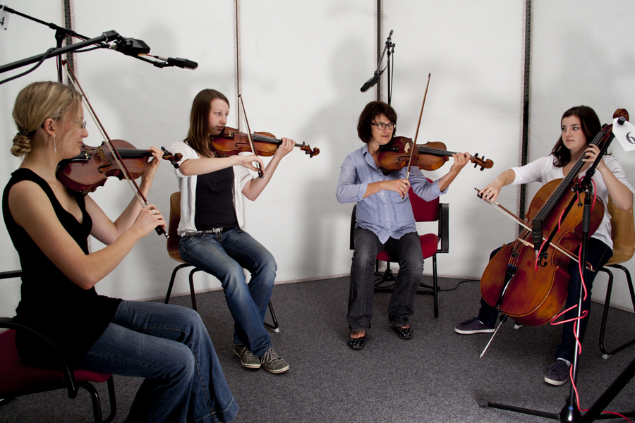 „Die Studioaufnahmen waren anstrengend. Aber für unsere Schülerinnen war diese Situation sehr motivierend“, so fasst Musikpädagogin Maria Anna Feldmeier-Zeidler vom Max-Reger-Gymnasium Amberg die Erfahrungen zusammen, die die Mitglieder des Streichquartetts der Schule gemacht haben, als sie an der Hochschule Aufnahmen für CD-Produktionen mit Werken unter anderem von Joseph Haydn und Scott Joplin anfertigen ließen. Die Studioaufnahmen entstanden im Rahmen eines Gemeinschaftsprojekts mit dem Studiengang Medienproduktion und Medientechnik (Fakultät Elektro- und Informationstechnik).