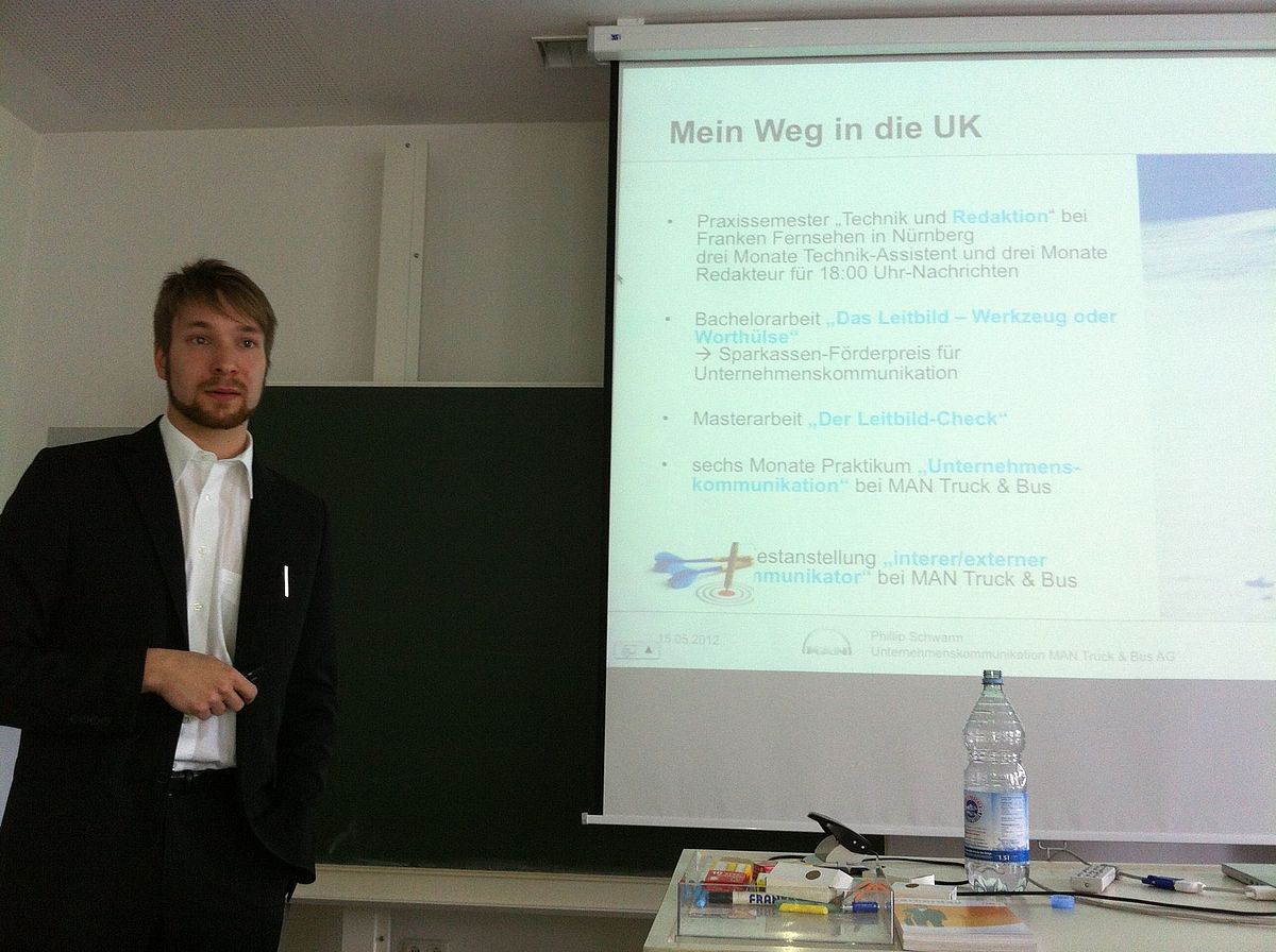 M. Eng. Phillip Schwarm, Absolvent der Medientechnik und Medienproduktion (Master), folgte einer Einladung von Prof. Dipl.-Ing. Maximilian Kock, und berichtete über die Berufstätigkeit der Alumni in der Industrie. Phillip Schwarm ist seit seinem Studienabschluss 2010 in der Unternehmenskommunikation der MAN Truck & Bus AG (Nürnberg) tätig.