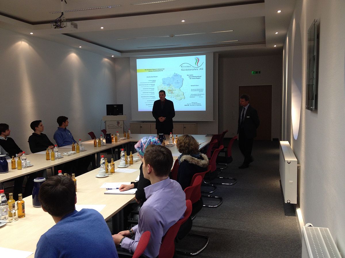 In diesem Zusammenhang fand die Lehrveranstaltung „Krankenhausmanagement und Entwicklungen im Gesundheitswesen“ bei Prof. Dr. med. Clemens Bulitta (Studiengang Medizintechnik) einen besonderen Abschluss: Die Studierenden des 6. Semesters besuchten die Klinikleitung des Klinikums Weiden und erhielten dort einen Überblick über das Management der Kliniken Nordoberpfalz AG. Die wichtigsten Aufgaben wurden den Studierenden aus Sicht des Vorstandes in Vertretung durch Manfred Tretter, den Ärztlichen Direktor Dr. Thomas Egginger und den Pflegedirektor Thomas Baldauf einleitend vorgestellt. Anschließend folgten detaillierte Informationen zu den Aufgaben und Inhalten der Abteilungen Personalwesen, Controlling, Zentrale Finanzen, Einkauf, und Medizincontrolling.