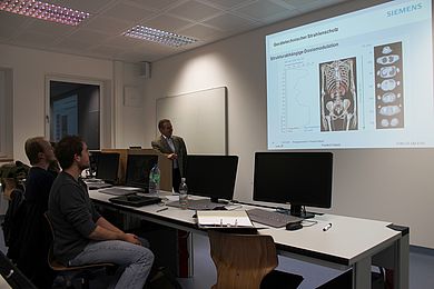 In drei Übungen konnten die Studierenden mit Hilfe von praxisrelevanten Fällen den Strahlenschutz anhand von Normen, Richtlinien und der Röntgen- und Strahlenschutzverordnung planen. Dies ist eine zentrale Aufgabe und hebt den Wettbewerbsvorteil heraus, wenn dem Kunden Gesamtlösungen für Medizintechnik-Produkte präsentiert werden.