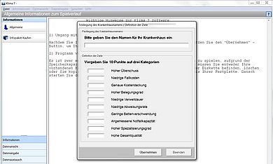Durchgeführt wurde das Planspiel von Prof. Dr. Michael Grütz und seinem Mitarbeiter, Herrn Redschlag, von der HTWG Konstanz. Mit KLIMA XP machten sich die Teilnehmerinnen und Teilnehmer mit einem Finanzierungssystem, das sich an diagnoseabhängigen Fallpauschalen orientiert, vertraut. Gleichzeitig führte das Planspiel in die Kosten- und Leistungsrechnung ein. Grundlage des Planspiels ist ein 420-Betten Akutkrankenhaus, das tatsächlich existiert. Für die Patientenankünfte sowie Verweildauern gelten diagnosespezifische Wahrscheinlichkeitsverteilungen. Anwenderinnen und Anwender haben zuerst ihre Ziele zu definieren, ehe sie in einer Folge von maximal 10 Perioden Entscheidungen fällen müssen.