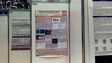 Prof. Dr. Ralf Ringler präsentierte aktuelle Forschungsergebnisse der OTH Amberg-Weiden: In zwei Poster-Beiträgen stellte er Medizintechnik und Aktivitäten aus dem Labor der personalisierten Medizin dem interessierten Fachpublikum vor. Im ersten Beitrag „Thyroidal diagnostics need optimized collimation and segmentation within 2D-imaging“ rückte er die optimierte Untersuchung der Schilddrüse in den Mittelpunkt; im zweiten legte er unter dem Titel „Advantages of thyroidal therapy uptake calculation with 2D-diagnostic imaging” den Fokus auf eine optimierte Strategie zur Therapie der Schilddrüse.