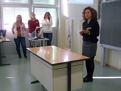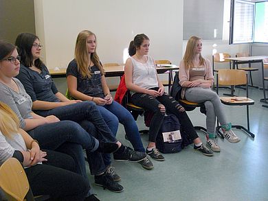 Özlem Ajazaj-Tangobay, Projektkoordinatorin des Gender- und Diversitybüros, gewährte, unterstützt von Praktikantin Danida Bock, den Schülerinnen einen kurzen Einblick in die Studienmöglichkeiten an den Standorten Amberg und Weiden. Gemeinsam mit den Studentinnen Sinah Käfferlein (Patentingenieurwesen) und Sarah Kerling (Umwelttechnik) stellten sie auch das MINToring- Projekt vor. Im anschließenden Austausch beantwortete das Team der OTH nicht nur weitere Fragen zum Projekt, sondern diskutierte auch angeregt mit den Teilnehmerinnen über Studiengänge und Studentenleben.