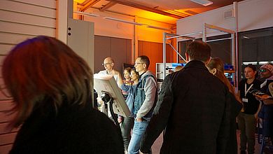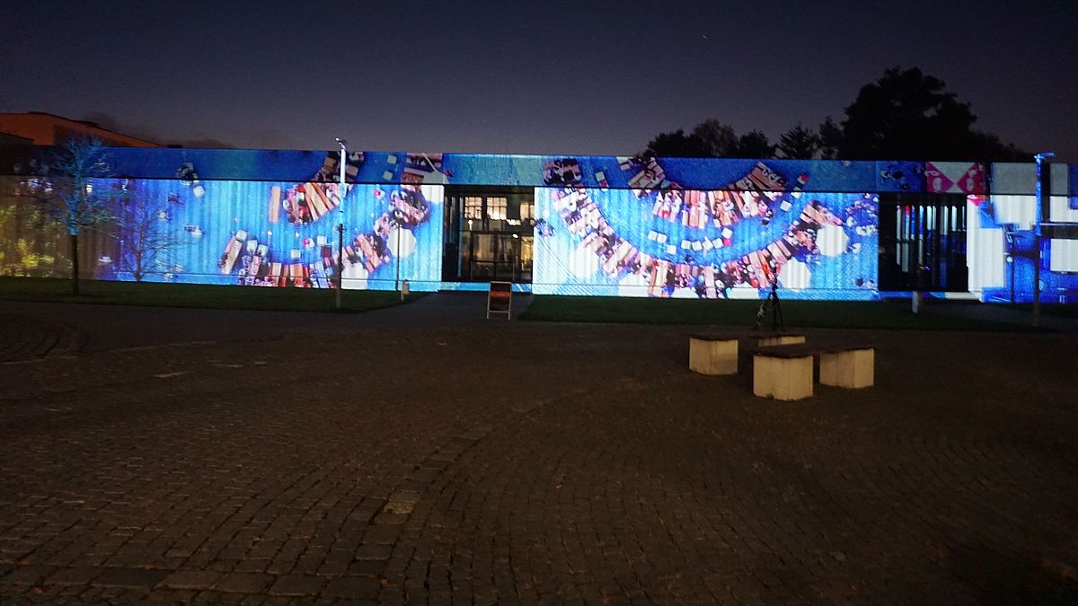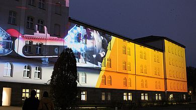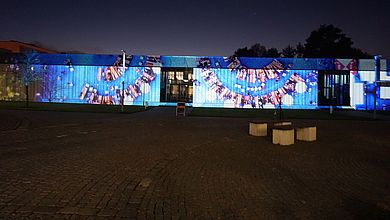Auch eine eindrucksvolle Fassadenillumination, gestaltet von Studierenden des Labors für Visual Computing, sorgte für großes Aufsehen. Die gesamte Rückseite des EMI-Gebäudes verwandelte sich am Freitagabend in eine riesige Leinwand, auf der künstlerisch das „Innenleben“ der Hochschule dargestellt wurde.