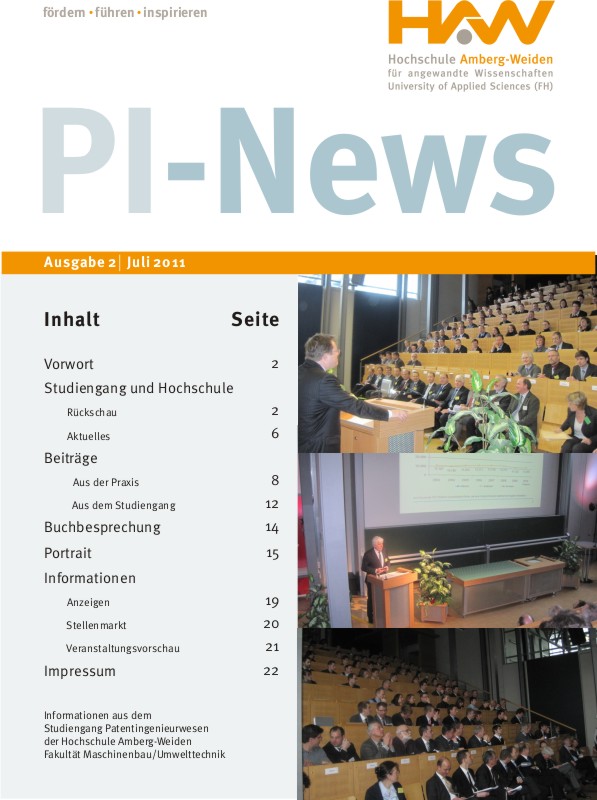Zum Ende des Sommersemesters ist die zweite Ausgabe des Newsletters im Studiengang Patentingenieurwesen (PI) erschienen. Die vom News-Team Prof. Dr. Andrea Klug, Michelle Küppers und Sandra Holfelder (Patentingenieurwesen) erstellten PI-News enthalten wieder Informationen zu aktuellen Entwicklungen im Studiengang Patentingenieurwesen, so zur Umstellung vom Diplom- auf den Bachelorabschluß zum Wintersemester 2011/2012, und zur erfolgreichen Akkreditierung des Bachelorstudiengangs.