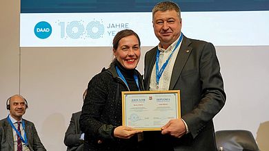 Für ihren besonderen persönlichen Beitrag zum Aufbau und zur Stärkung der Partnerschaft zwischen deutschen und ukrainischen Universitäten überreichte der Rektor der Nationalen Universität „Zaporizhzhia Polytechnic“, Viktor Greshta, der Projektleiterin Prof. Dr. Julia Heigl im Rahmen der Konferenz die Urkunde zur Verleihung der Ehrenprofessur der Nationalen Universität „Zaporizhzhia Polytechnic“. Diese Auszeichnung ist ein Symbol für gegenseitiges Vertrauen, Respekt und eine gemeinsame Vision der langfristigen akademischen Zusammenarbeit zwischen Universitäten in Deutschland und der Ukraine.