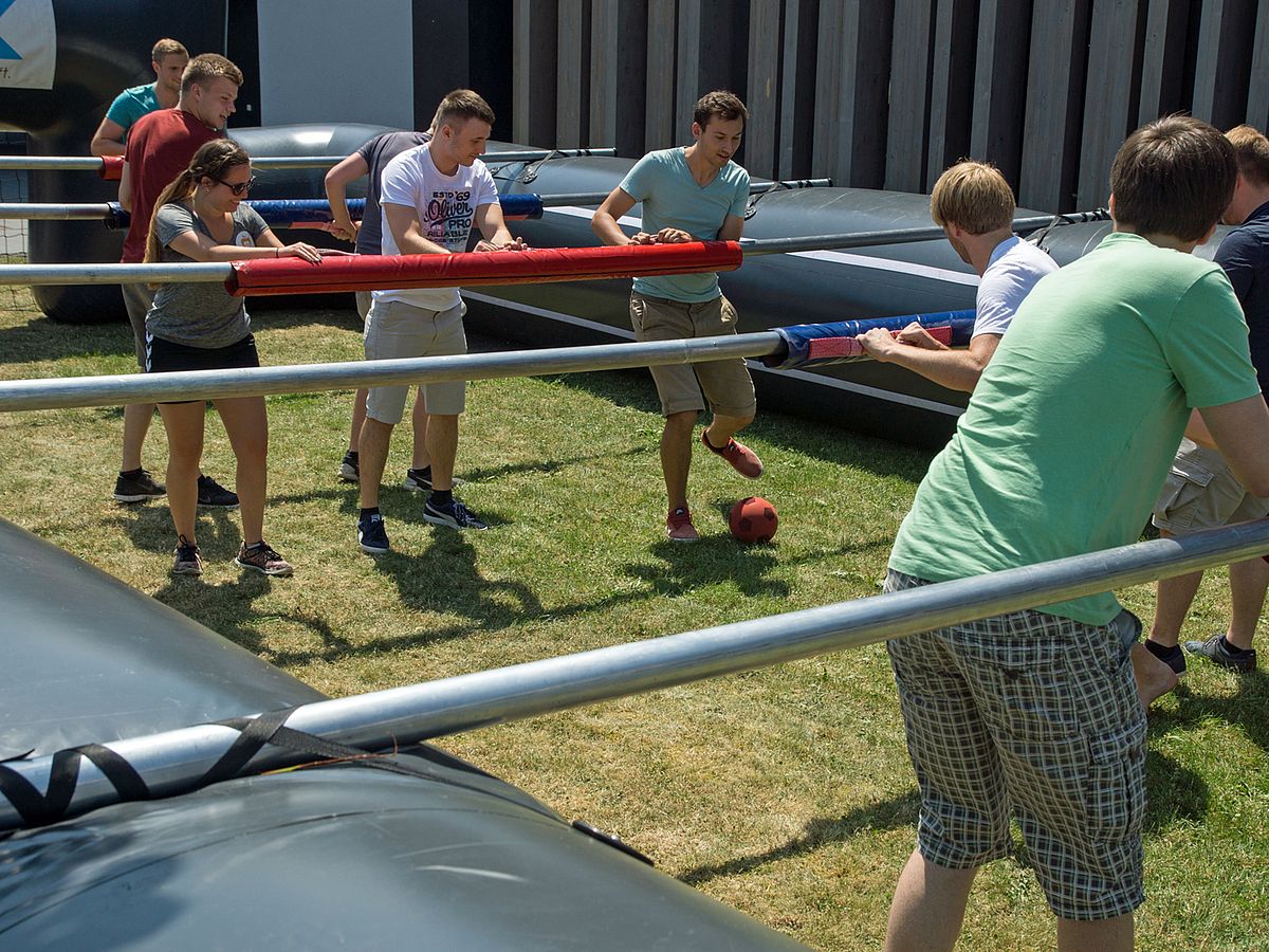 Wer wollte, konnte am Campus Körbe werfen, auf eine Torwand schießen oder Badminton spielen. Schon am Beginn der Veranstaltung brachte eine Zumba-Trainerin die Tanzgruppe zum Schwitzen – am Abend lieferten sich mehrere Mannschaften spektakuläre Matches beim Lebendkicker-Turnier.