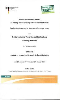 Die OTH Regensburg und die OTH Amberg-Weiden erhalten für die Umsetzung ihres gemeinsamen Weiterbildungskonzepts „OTH mind: Modulares innovatives Netzwerk für Durchlässigkeit“ aus dem Programm „Aufstieg durch Bildung: Offene Hochschule“ des Bundesministeriums für Bildung und Forschung (BMBF) eine Förderung des Bundes in Höhe von 3,4 Millionen Euro. Der Parlamentarische Staatssekretär im Bundesministerium für Bildung und Forschung (BMBF), MdB Stefan Müller, überreichte am 5. September 2014 in Begleitung durch MdB Albert Rupprecht, Bildungs- und forschungspolitischer Sprecher der CDU/CSU im Deutschen Bundestag, den Präsidenten Prof. Dr. Erich Bauer und Prof. Dr. Wolfgang Baier in Weiden den Zuwendungsbescheid.