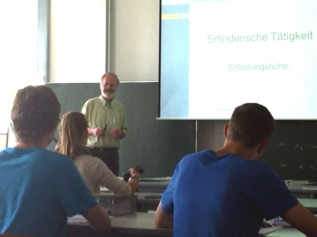 Nach einer Einführung in die rechtlichen Grundlagen zeigte Herr Werner Bertl im Diskurs mit den Studierenden anhand von Entscheidungen und praktischen Beispielen aus der Rechtsprechung des Bundespatentgerichts und des Bundesgerichtshofs die Beurteilungskriterien und –verfahren für die Feststellung der erfinderischen Tätigkeit auf.