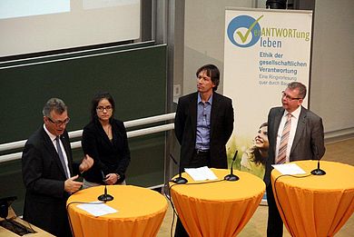 Im Anschluss an sein Impulsreferat diskutierte Siegfried Schneider mit Britta Henseli, Studentin der Medienproduktion und Medientechnik an der HAW, und OStD Wolfgang Wolters, Schulleiter des Max-Reger-Gymnasiums Amberg, das Spannungsfeld zwischen dem Verlust von Privatsphäre und dem Gewinn neuer sozialer Räume, in dem sich die Nutzer von Social Media-Plattformen bewegen. Erstmals ist das EthikForum an der HAW Teil der Ringvorlesung „VerANTWORTung leben“, die der Bayerische Philologenverband e. V. landesweit veranstaltet.