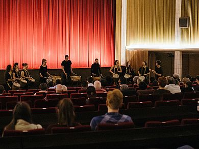 Begleitet wurde die Filmvorführung von einem interessanten Austausch mit dem Filmteam, bei dem es Hintergrundinformationen und Anekdoten zum Dreh in Kenia gab. Musikalisch umrahmt wurde der Abend vom Percussion Ensemble der OTH Regensburg, das die Zuschauer mit afrikanischen Klängen verzauberte.