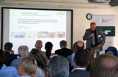 Der 22. Juli stand unter dem Motto „Umweltcluster meets Umweltpakt“ und wurde in Kooperation mit dem Bayerischen Staatsministerium für Umwelt und Verbraucherschutz durchgeführt. Nahezu 100 Teilnehmer kamen, um durch Impulsvorträge Anregungen in Sachen Umwelttechnologie zu sammeln und sich auf dem „Marktplatz der Ideen“ auszutauschen. Den Einstieg in das weite Feld der Umwelttechnologie machte Prof. Dr. Franz Bischof, der mit der Ostbayerischen Technischen Hochschule Amberg-Weiden Clustermitglied der ersten Stunde ist. Er sprach über die künftigen Herausforderungen und Anforderungen in der Umwelttechnologie.