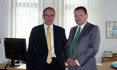 Prof. Dr. Thomas Dommermuth, Fakultät Betriebswirtschaft, blickt auf eine 25-jährige Karriere im öffentlichen Dienst zurück. Prof. Dr. Erich Bauer, Präsident der OTH Amberg-Weiden, gratulierte heute zum Dienstjubiläum, überreichte ihm die Dankesurkunde und sprach ihm im Namen des Freistaates Bayern und der Hochschulleitung Dank aus.