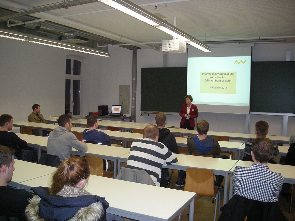 Rund 20 beruflich Qualifizierte nahmen am 21. Februar 2014 die Gelegenheit wahr, sich über das berufsbegleitende Propädeutikum (Studienvorbereitungskurs) an der OTH in Amberg zu informieren. Erläutert wurden der Umfang der einzelnen Module, die Online-Plattform, der Selbsteinschätzungstest bis hin zu den Kursgebühren.