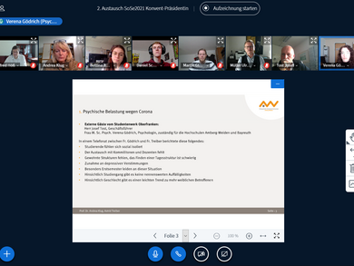 Zu besonderen Themen werden auch externe Gäste geladen – so waren beim letzten Treffen der Geschäftsführer des Studentenwerks Oberfranken, Josef Tost, und die für unsere Hochschule zuständige Psychologin, M. Sc. Psych. Verena Gödrich, dabei. Sie berichtete von ihren Erfahrungen mit Studierenden hinsichtlich der psychischen Belastungen aufgrund von Corona und den diesbezüglichen Angeboten des Studentenwerks.