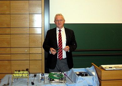 Laut Aussage von Prof. Dr. med. Dietl ist der Chirurg zunehmend von der technischen Ausstattung und deren einwandfreier Funktion abhängig. Um die Studierenden für die Neu- und Weiterentwicklung von spezifischen Instrumenten für die Chirurgie - in Kooperation zwischen dem Chirurgen und dem Medizintechnikingenieur - zu motivieren, erläuterte der Chefarzt der Klinik für Allgemein-, Thorax- und Viszeralchirurgie anhand der mitgebrachten Instrumente deren Anforderungen und Funktionen. Abgerundet wurde der imposante Vortrag durch eine lebendige und sehr interessante Diskussion zwischen dem Referenten und den Studierenden.