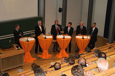 Im Anschluss an die Begrüßung der hochrangigen Gäste durch Prof. Dr. Erich Bauer, Präsident der HAW, und Wolfgang Dandorfer, Oberbürgermeister der Stadt Amberg, wurde im Siemens Innovatorium im Rahmen einer Podiumsdiskussion mit den Staatsminister Dr. Wolfgang Heubisch, Staatsminister Martin Zeil, Prof. Dr. Markus Brautsch (Fakultät Maschinenbau / Umwelttechnik der HAW, Leiter des Instituts für Energietechnik IfE GmbH), Prof. Dr. Erich Voss (HAW-Hochschulrat und Vorsitzender der Amberger Freunde der HAW e. V.) und Dr. Rolf Pfeiffer (Vorsitzender des IHK-Gremiums Amberg-Sulzbach) der Themenkreis der umweltgerechten Energietechnik an der HAW erläutert, souverän moderiert durch Hans Klemm, Chefredakteur des Medienhauses Der neue Tag.