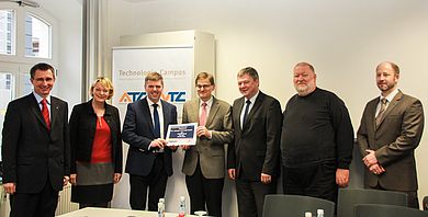 1.000 Kilowattstunden Strom pro Jahr und eine Laufzeit von 5 Jahren – Die Stadtwerke Amberg GmbH überreichte in Begleitung von Karlheinz Brandelik, Projektleiter der Gewerbebau Amberg GmbH, erneut einen Stromgutschein an die Hochschulleitung für den Amberger Technologie-Campus (ATC).