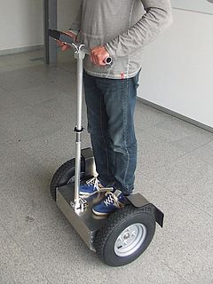 Den elektrischen Aufbau des Projekts übernahm Laboringenieur Dipl.-Ing. (FH) Jürgen Stich. Für die Erstellung der Software und die Gesamtleitung zeigte sich Prof. Dr.-Ing. Armin Wolfram, Fakultät Maschinenbau/Umwelttechnik. verantwortlich. Als typisches mechatronisches System enthält das Fahrzeug einerseits einen mechanischen Grundaufbau, auf dem die Lenkeinrichtung, die Räder mit Antriebseinheiten sowie alle weiteren Komponenten angebracht sind. Des Weiteren wird Elektronik zur Ansteuerung der Elektromotoren, zur Informationsverarbeitung sowie zur Messung verschiedener Signale, wie z.B. die aktuelle Neigung, der Lenkwinkeleinschlag und die Fahrzeuggeschwindigkeit benötigt. Daneben ist für die Bereitstellung der Funktionalität umfangreiche Software erforderlich. Diese beinhaltet einerseits Verfahren zur Auswertung und Überwachung der Messsignale. Andererseits müssen während der Fahrt stets Regler im Eingriff sein, um das Fahrzeug zu stabilisieren. So erfolgt die Steuerung der Fahrzeuggeschwindigkeit durch den Fahrgast ausschließlich durch Gewichtsverlagerung, wobei die notwendige Gegenkraft, um das Fahrzeug in der senkrechten Position zu halten, von den Elektromotoren bereitgestellt wird.