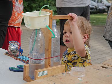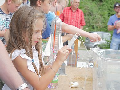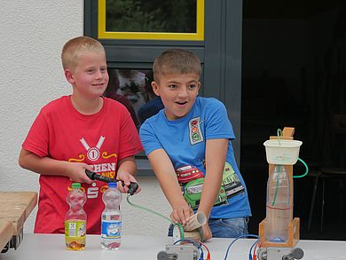 Nach dem Motto „Technik begreifen“ wurden originelle, anschauliche Modelle vorgeführt. Das Besondere daran ist, dass alle Modelle aus üblichen Alltagsgegenständen erstellt wurden, die man in dieser Zusammensetzung nicht erwartet. Dabei hatten nicht nur die Kinder unglaublich Spaß und viele „Aha-Momente“, sondern auch die Erwachsenen kamen auf ihre Kosten. Als krönender Abschluss wurde dann eine Wasser-Raketen aus Plastikflaschen in den Himmel – und auf das Schuldach – geschossen.