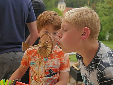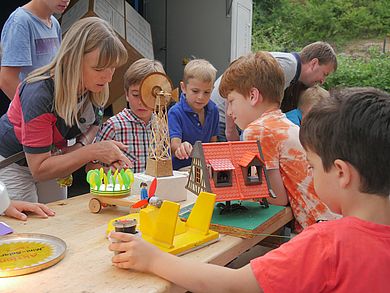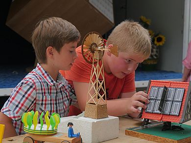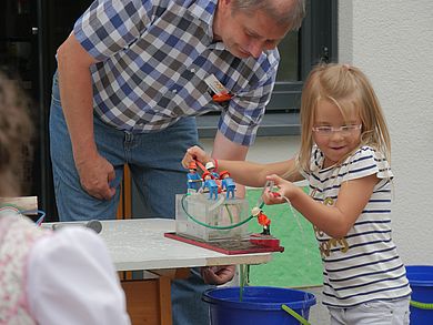 An einem Aktionsstand „Technik erleben“ konnten sich die Schülerinnen und Schüler unter der Anleitung von Manfred Bauer austoben, basteln und experimentieren. Die alternativen Energien bilden hierbei den Angebots-Schwerpunkt. An einem künstlichen Bach konnten Wasserräder aus Pommes-Gabeln gebaut und anschließend sofort getestet werden. In einem Hexenhaus wurde eine Playmobil-Waschmaschine allein durch Sonnenenergie betrieben. Neben verschiedensten weiteren Wassermodellen, Solarautos und einer Feuer-Lösch-Spritze war die Druckluft-Kanone das beliebteste Testobjekt.