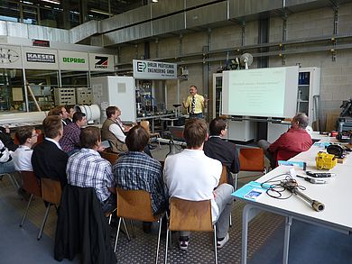 Er machte hierbei deutlich, dass dabei unnötige und sehr hohe Energiekosten anfallen können. Gemeinsam wurden Lösungsansätze diskutiert, um diese Kosten einzusparen. Im Anschluss an den einstündigen Vortrag erläuterte Dipl.-Ing. Harald Wirth (Fakultät Maschinenbau/Umwelttechnik) den Prüfstand für Abgasdrosselklappen sowie den Filterprüfstand im Labor Strömungstechnik. Prof. Dr. Weiß demonstrierte den Besuchern zudem die Möglichkeiten des „Prüfstand für Druckluftantriebe und –technik (PDLT)“ im Labor Strömungsmaschinen.