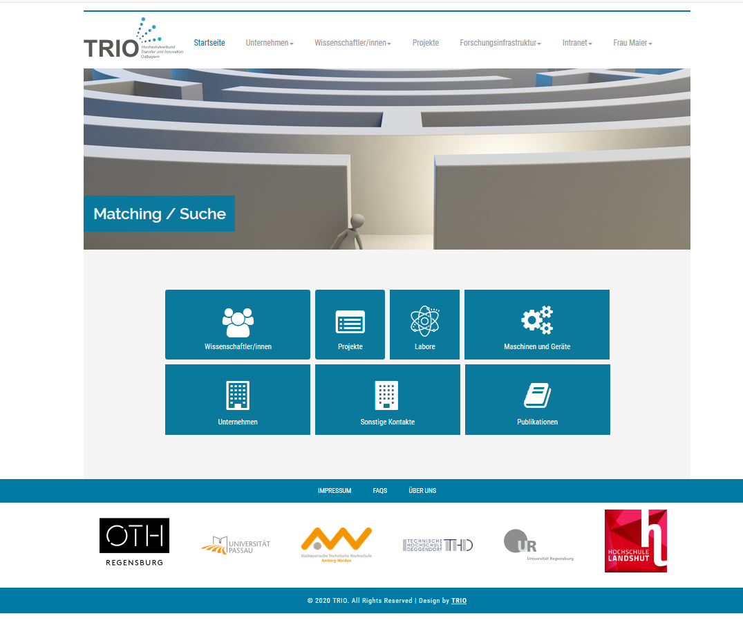 Das Prinzip dahinter ist einfach: Die Wissenschaftlerinnen und Wissenschaftler der sechs Verbundhochschulen (OTH Amberg-Weiden, TH Deggendorf, Hochschule Landshut, Universität Passau, OTH Regensburg und Universität Regensburg) legen im TRIO-Transferportal ein Profil mit ihren Kernkompetenzen und Forschungsschwerpunkten an. Gleichzeitig werden dort Unternehmenskontakte und gesellschaftliche Einrichtungen mit ihren möglichen Bedarfen aufgenommen. Die Transferstellen aller sechs TRIO-Verbundhochschulen haben Zugriff auf das Portal und können so zielgerichtet potenzielle Kooperationspartner zusammenbringen. Durch den gezielten Abgleich von konkreten Anfragen aus Wirtschaft und Gesellschaft mit den Möglichkeiten der wissenschaftlichen Forschung in der Region unterstützt das TRIO-Transferportal zukünftig die Anbahnung von Kooperationspartnerschaften und Transferprojekten.