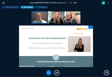 Zunächst begrüßte Prof. Dr. Gabriele Murry die virtuell anwesenden Gäste, die sich wieder zahlreich zur Veranstaltung research@WEIDEN BUSINESS SCHOOL eingefunden hatten und stellte die Referentin kurz vor. Eva Renner begann ihren Vortrag sogleich mit einer prägnanten Zusammenfassung ihrer Masterarbeit: „Ziel war es ein E-Learning Konzept zu verfassen, in welchem den Führungskräften des Klinikums ihre Aufgaben im Bereich Personalentwicklung der Mitarbeitenden vermittelt wird.“