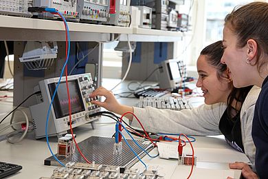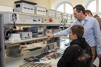 Weitere Programmpunkte waren eine Vorfühung von Prof. Dr. Ulrich Vogl im Labor Digitale Signalverarbeitung und ein Besuch im Labor Elektrische Maschinen. Abschließend lernten die Schülerinnen und Schüler bei einem Rundgang den Campus kennen, warfen einen Blick in eine Vorlesung im Audimax und schauten der ausgestellten Rennwagen in MB/UT an.
