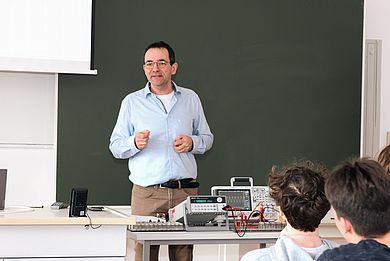 Prof. Matthias Söllner und Günter Demleitner haben für die SchülerInnen ein abwechslungsreiches Programm zusammengestellt. Nach einem kurzen Vortrag über den Studiengang Elektro- und Informationstechnik erhielten die Gymnasiasten eine Einführung in das Thema „Der elektrische Schwingkreis”. Das Basiswissen hatte Oberstufenkoordinator StD Christian Huber zuvor im Schulunterricht vermittelt. Im Anschluss ging es von der Theorie in die Praxis: Im Hörsaal wurden die SchülerInnen von Prof. Söllner in die Geräte, die im Labor verwendet werden, eingeführt. Anschließend konnten die die SchülerInnen im selbst im Labor Elektronik einen Versuch durchführen: Durch Suchen von Resonanzen beim elektrischen Schwingkreis die Induktivität L einer Spule messen.