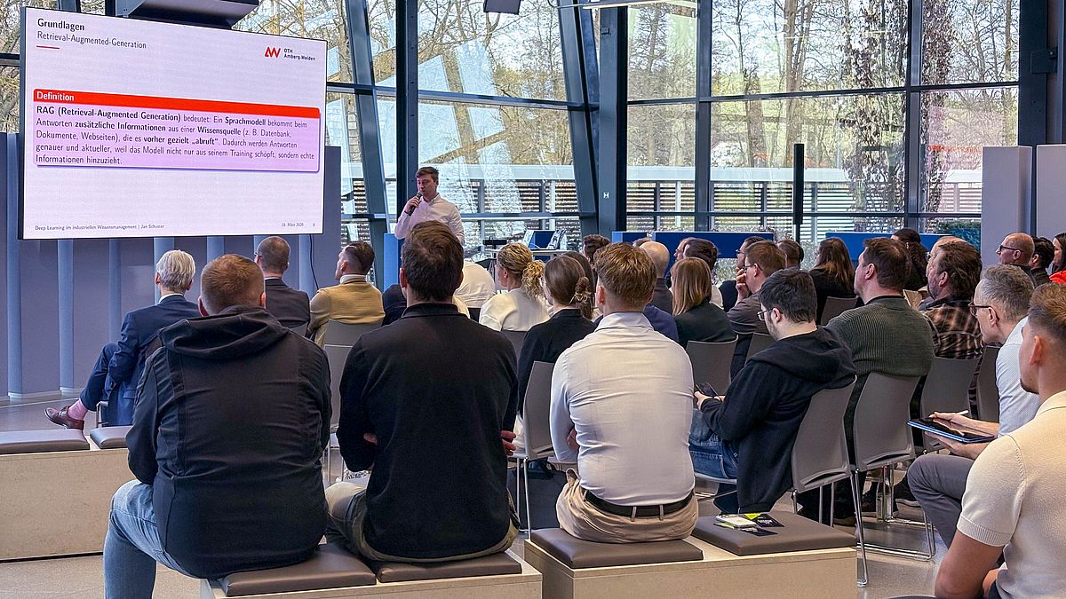 Jan Schuster (TTZ Neustadt a.d. Waldnaab, OTH Amberg-Weiden) widmete sich dem Thema „Deep Learning im industriellen Wissensmanagement“. Im Kontext zunehmender Digitalisierung entstehen große Mengen heterogener Daten aus unterschiedlichen Domänen. Diese enthalten ein erhebliches, häufig implizites Informationspotenzial. Der Vortrag zeigte auf, wie Methoden des Deep Learning – insbesondere aus dem Bereich Natural Language Processing – genutzt werden können, um diese Daten systematisch zu erschließen, aufzubereiten und für spezifische Fragestellungen effizient nutzbar zu machen.