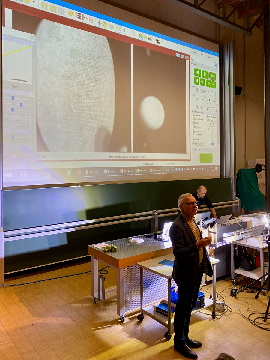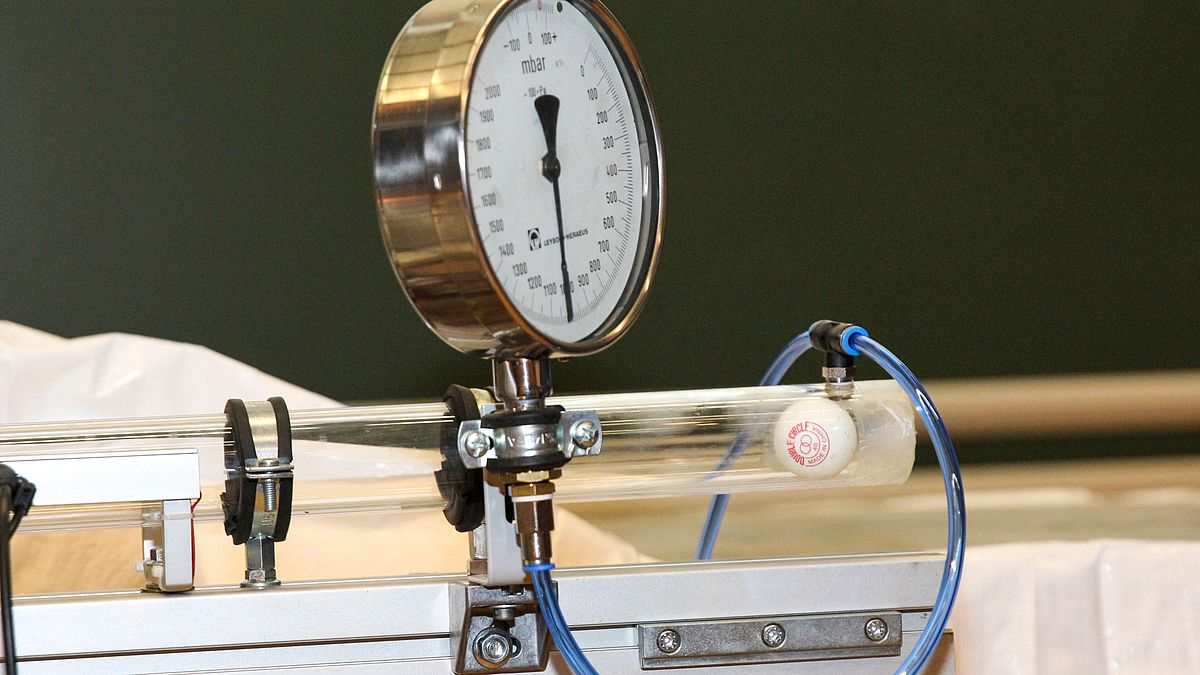 Gastgeber Prof. Dr. Mändl eröffnet die Vorlesung und zeigt, dass Luft alles andere als harmlos ist. Mit einem faszinierenden Experiment beweist er, dass Luft eine „dicke Pampe“ sein kann. In seinem Versuchsaufbau wird ein Tischtennisball zunächst in das offene Ende eines langen Rohres gelegt und das Rohr zugeklebt. Als nächstes wird die Luft aus dem Rohr gepumpt und dann das Vakuum an der hinteren Folie mit einem spitzen Gegenstand zerstochen. Die eindringende Luft ist so stark, dass der Tischtennisball mit Überschallgeschwindigkeit aus dem Rohr geschossen wird. Die passenden Beweisbilder liefert die Hochgeschwindigkeitskamera von Prof. Dr. Marco Taschek.