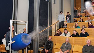 Als Teil der Tradition der Weihnachtsvorlesung darf natürlich der Rauch nicht fehlen. Prof. Dr. Mändl lässt daher Rauchkringel aufsteigen und zielt auf Pappbecher, die auf den Köpfen der Studierenden platziert sind.