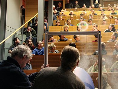 Wissenschaft und Technik ist alles andere als trocken und langweilig. Das hat die letzte Vorlesung an der Fakultät Maschinenbau/Umwelttechnik in diesem Jahr gezeigt. Der „Lehrstoff“ der Weihnachtsvorlesung: Unterhaltsame Experimente aus der Physik und der Kunststofftechnik, quadratische Löcher, „OTH-Elo“und riesige Rauchkringel.