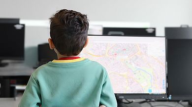 Danach ging es zu einer Mittagspause zurück an die Hochschule, um gestärkt an den zweiten Teil der Nachforschungen zu gehen: Im Computerlabor Geoinformatik wurden den Kindern mit Unterstützung von Studenten erklärt, wie sie im BayernAtlas das soeben draußen erprobte, nun auch digital umsetzten können. So wurde die Stadtmauer anhand der topographischen Karte und des Luftbildes digital ‚abgeklickt‘. Die Längen der einzelnen Gruppen sind dann gesammelt worden und der Mittelwert, auf den die Kinder gekommen sind, ergibt circa 2500 Meter!
