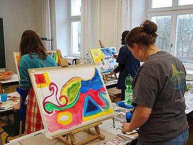 Die Angelika Aldenhoff-Artz führte die Teilnehmerinnen von einfacheren Übungen mit dem Zeichnen der Grundformen mit Bleistiften zu bunten Kreisbildern mit Wachsmalstiften bis hin zu großen Gemälden mit den Gouache-Farben. Dabei war die Verschiedenartigkeit der Bilder und die unterschiedlichsten individuellen Vorgehensweisen spannend zu beobachten. Eine wichtige Exkursion bestand darin, sich über die Grundformen bewusst zu werden. Alles besteht aus Grundformen und lässt sich darauf reduzieren. Diese Formen, wie Kreise und Dreiecke, treffen wir überall in der Natur an und lassen sich sogar in unserer Schrift des ABC‘s wiedererkennen. Zudem lernten die Teilnehmerinnen die richtige Haltung des Stiftes und des Körpers, um frei und offen zeichnen und malen zu können.